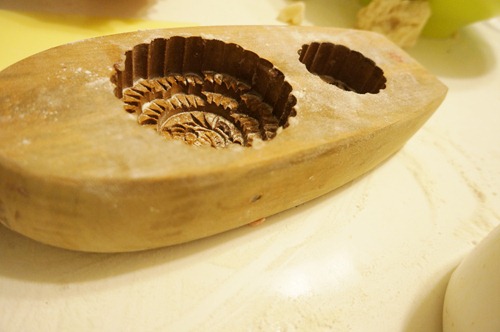 Press the dough and filling ball into a mooncake mould (I find it helps to dust the mooncake with a little flour first to avoid the dough sticking to the mould).